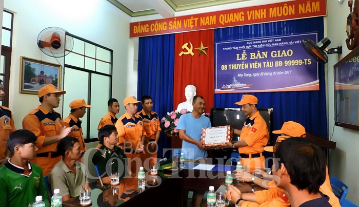 Lúc 8 giờ sáng 28/3, tàu SAR 27-01 thuộc Trung tâm phối hợp tìm kiếm, cứu nạn hàng hải Việt Nam đã đưa 8 thuyền viên và lai dắt thành công tàu cá BĐ 99999-TS vào cảng Nha Trang an toàn.