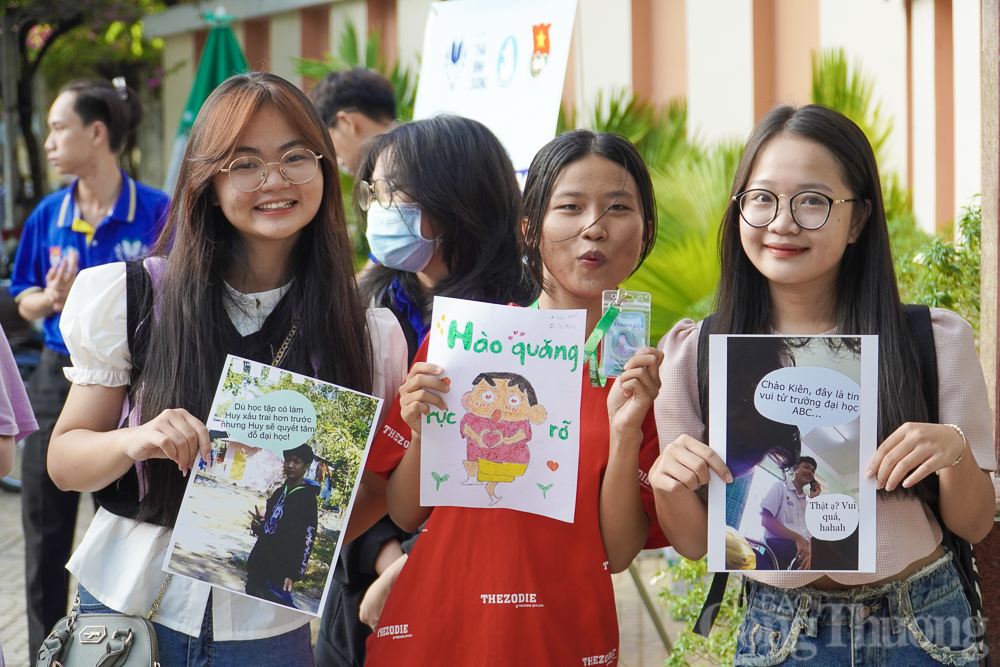 | Bạn Võ Phương Anh (bìa phải, học sinh lớp 11 trường THPT Nguyễn Văn Trỗi) cùng nhóm bạn đến điểm thi trường THPT Nguyễn Văn Trỗi cổ vũ cho các thí sinh vượt qua bài thi đầu tiên thành công. |