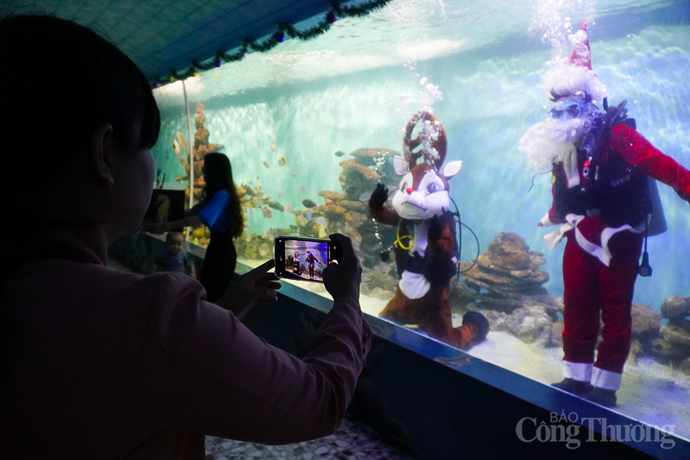 Chiều 19/12, những kỹ thuật viên Viện Hải Dương học (TP. Nha Trang, Khánh Hòa) đã hóa trang thành ông già Noel, tuần lộc và người tuyết lặn khắp bể kính vui chơi cùng đàn cá, mang đến không khí Giáng sinh đặc biệt cho khách tham quan.
