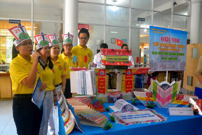 Tham gia hội thi có 40 học sinh và giáo viên đến từ 8 trường trung học cơ sở trên địa bàn TP. Nha Trang. Các đội đã trải qua hai phần thi: xếp sách nghệ thuật (thời gian 60 phút) và thuyết trình về mô hình sách (10 phút). Em Trần Nguyễn Hoàng Vy (Trường THCS Trưng Vương) chia sẻ: “Em rất vui khi được tham gia hội thi xếp sách năm nay. Thông qua cuộc thi chúng em mong muốn các bạn học sinh hãy yêu quý sách, chăm đọc sách để nâng cao kiến thức cho bản thân. Mong rằng cuộc thi sẽ được tổ chức hàng năm để học sinh chúng em có dịp để thể hiện sự sáng tạo, đem đến những tác phẩm nghệ thuật bằng sách ấn tượng hơn”.