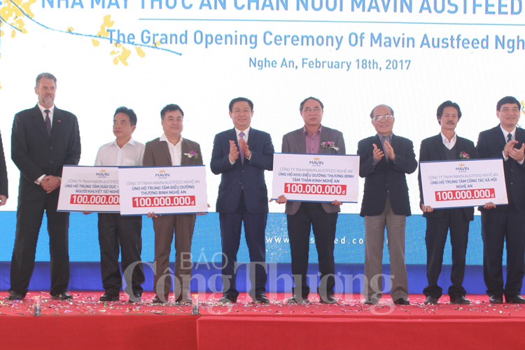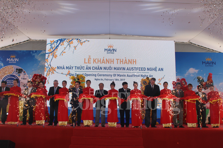 | Các đại biểu thực hiện nghi lễ cắt băng khánh thành Nhà máy thức ăn chăn nuôi Mavin Austfeed |