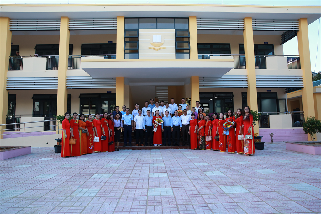 | Lãnh đạo Huyện ủy, UBND huyện Bình Sơn; Công ty BSR và tập thể giáo viên nhà trường chụp ảnh lưu niệm trước sảnh công trình. |