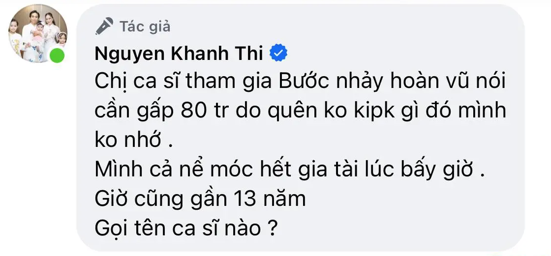 "Chị ca sĩ tham gia "Bước nhảy hoàn vũ" nói cần gấp 80 triệu đồng do quên không kịp làm gì đó mình không nhớ. Mình cả nể móc hết gia tài lúc bấy giờ. Giờ cũng gần 13 năm. Gọi tên ca sĩ nào?", Khánh Thi viết.