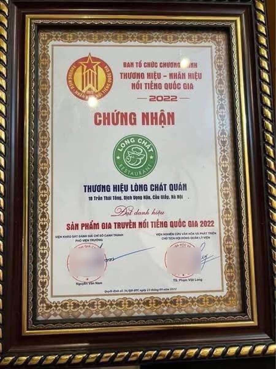 Trên trang cá nhân và một số nền tảng mạng xã hội, ông chủ Lòng Chát quán đăng tải hình ảnh cầm giấy chứng nhận ghi danh hiệu này do Viện Nghiên cứu Văn hóa và Phát triển cùng một số đơn vị tổ chức vào năm 2022.