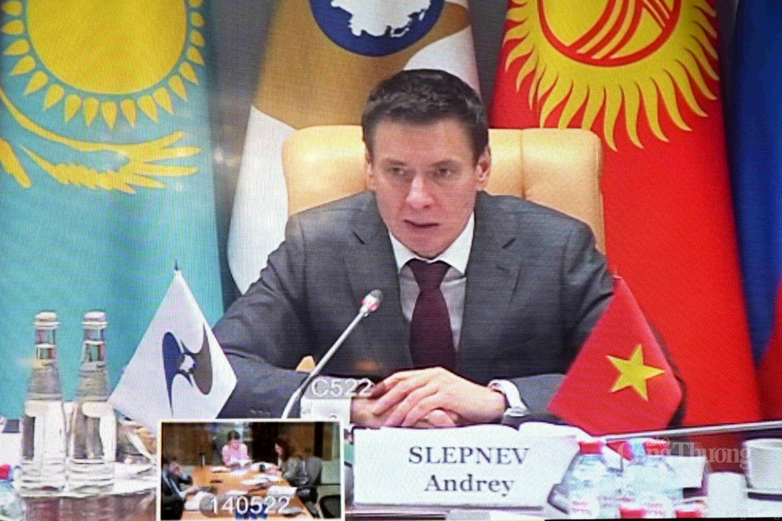 | Bộ trưởng Phụ trách Thương mại của Ủy ban Kinh tế Á - Âu Andrey Slepnev phát biểu trực tuyến tại Phiên họp |