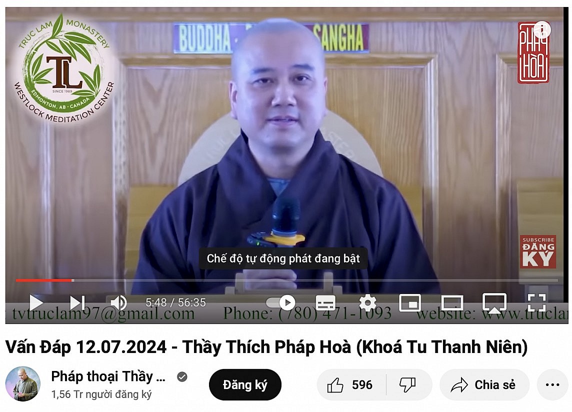 | Clip “Vấn Đáp 12/7/2024 – Thầy Thích Pháp Hoà” (Khoá tu Thanh niên) ngày 11/7/2024 tại tu viện Tây Thiên trên kênh Youtube Pháp thoại Thầy Pháp Hoà. Ảnh chụp từ màn hình |