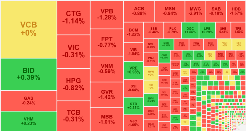 Áp lực giảm xuất hiện trên toàn bộ cổ phiếu ngân hàng sau đó lan rộng ra các nhóm ngành khiến VN-Index giảm 15,57 điểm.