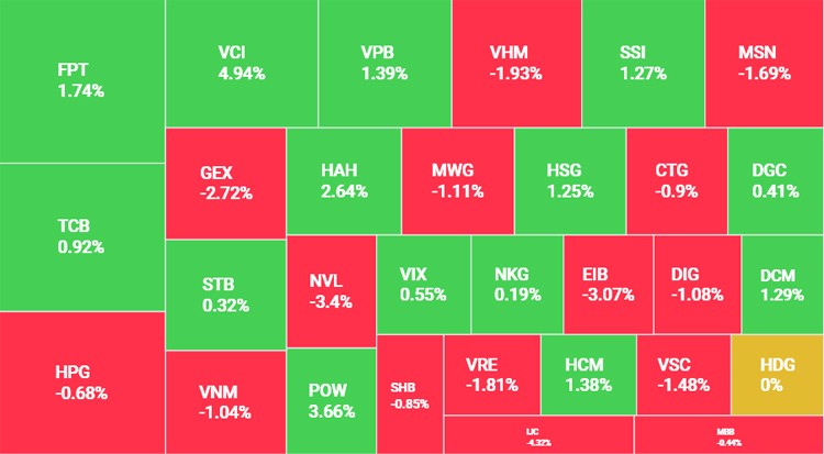 Cổ phiếu FPT tiếp tục lập đỉnh mới khi tăng 1,74% lên 146.500 đồng/cổ phiếu và dẫn đầu đà tăng của thị trường khi đóng góp 0,8 điểm. Một số mã khác cũng kéo tăng điểm tích cực như PLX, POW, VCI, SSI, LGC, VGC.