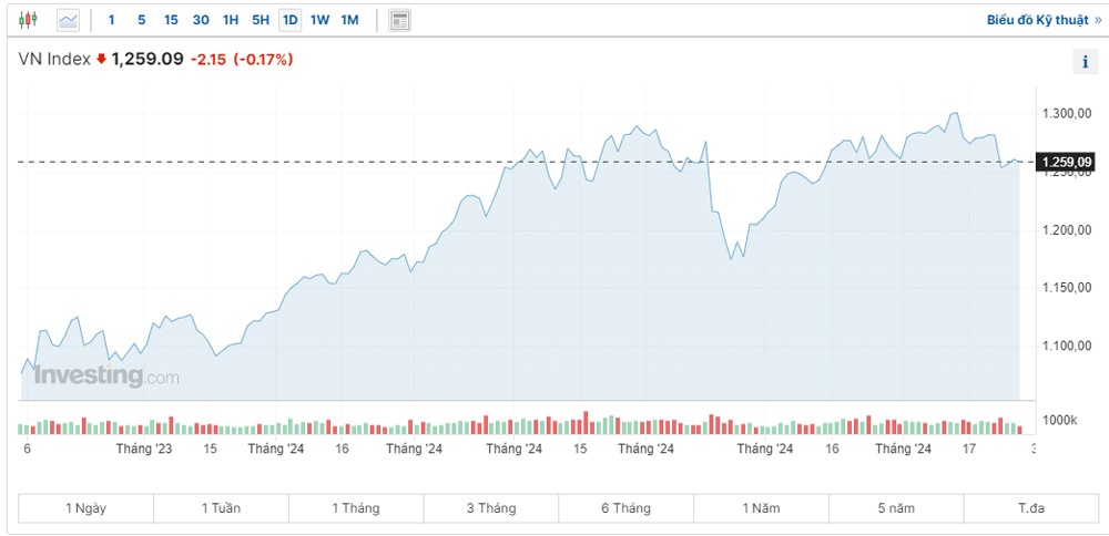 Đóng cửa phiên hôm nay 27/6, VN-Index giảm 2,15 điểm, tương đương 0,17% về 1.259,09 điểm, với thanh khoản thấp chỉ đạt hơn 17 nghìn tỷ đồng trên toàn thị trường. Toàn sàn HOSE có 175 mã tăng, 214 mã giảm và 93 mã đứng giá.
