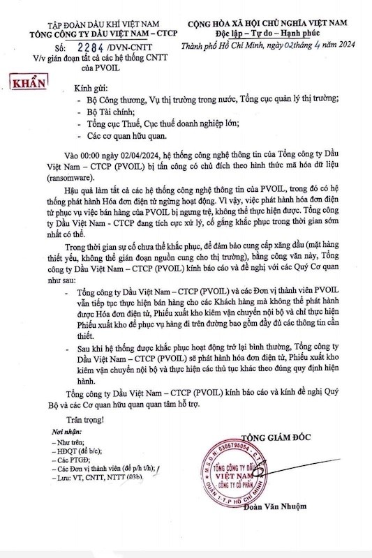Theo đó, trong văn bản khẩn gửi Bộ Công Thương, Vụ Thị trường trong nước, Tổng cục Quản lý thị trường, Bộ Tài chính, Tổng cục Thuế, Cục Thuế doanh nghiệp lớn và các cơ quan hữu qua, PVOIL cho biết: Vào 00:00 ngày 02/04/2024, hệ thống công nghệ thông tin của Tổng công ty Dầu Việt Nam – CTCP (PVOIL) bị tấn công bất hợp pháp có chủ đích theo hình thức mã hóa dữ liệu (ransomware).