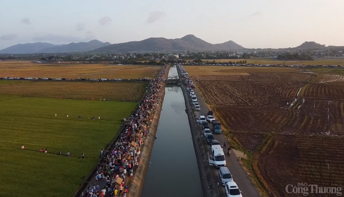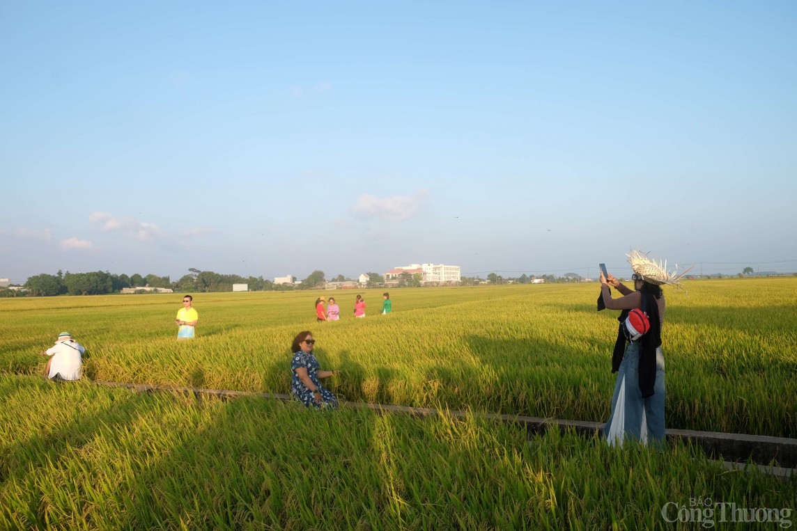 | Nhiều người men theo bờ ruộng check-in dưới ánh nắng chiều |