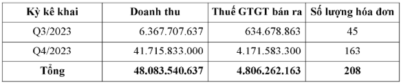 Theo dữ liệu, trong quý III/2023, doanh nghiệp này xuất 45 hóa đơn, doanh thu trên 6,3 tỷ đồng; quý IV/2023, doanh nghiệp này xuất ra 163 hóa đơn, doanh thu trên 41,7 tỷ đồng. Tính tổng 6 tháng cuối năm 2023, doanh nghiệp này xuất ra 208 hóa đơn với doanh thu trên 48 tỷ đồng.