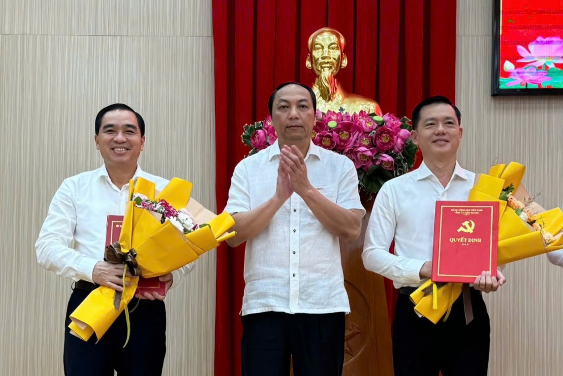 | Chủ tịch UBND tỉnh Kiên Giang Lâm Minh Thành trao quyết định cho ông Nguyễn Thanh Tùng (bên phải) và ông Huỳnh Quang Hưng. |