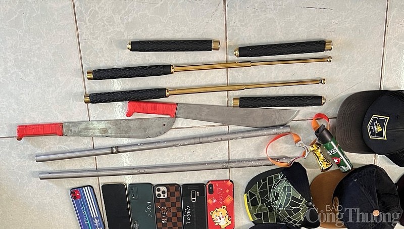 Nhiều hung khí nguy hiểm thu giữ khi khám xét nơi ở của các đối tượng. |