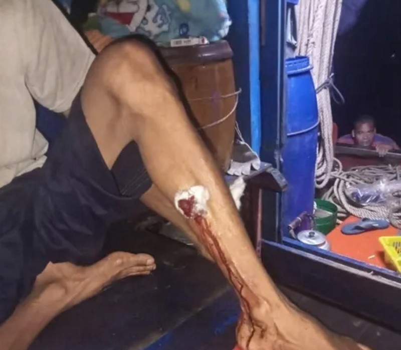Ngư dân Lê Thành Việt (45 tuổi, tàu KG-62299-TS) bị đạn chì bắn xuyên bắp chân.(Ảnh ngư dân cung cấp)
