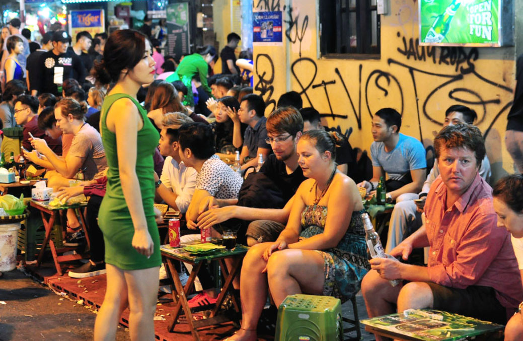 | Khách quốc tế uống bia tại phố Tạ Hiện (Ảnh balotrainghiem). |