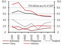 Ở khu vực châu Á đang nổi, Việt Nam chiếm thị phần FDI so với GDP cao nhất. Các doanh nghiệp nước ngoài chủ yếu tham gia đầu tư ở các lĩnh vực “màu mỡ” trong khu vực sản xuất để tận dụng lợi thế về chi phí lao động tương đối, đặc biệt là đối với các ngành cần nhiều lao động.
