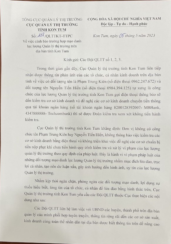 Theo Cục Quản lý thị trường tỉnh Kon Tum, đã có 10 trường hợp hộ kinh doanh trên địa bàn tỉnh bị hai đối tượng Phạm Trung Kiên (số điện thoại 0962.247.6xx) và Nguyễn Tiến Hiển (số điện thoại 0984.394.1xx) tự xưng là công chức của lực lượng Quản lý thị trường tỉnh Kon Tum gọi điện thoại thông báo sẽ đến kiểm tra cơ sở kinh doanh và đề nghị các cơ sở kinh doanh chuyển tiền qua tài khoản ngân hàng do Kiên và Hiển cung cấp để không bị kiểm tra.