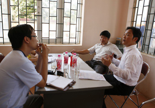Anh Lò Thanh Thảo- cửa hàng trưởng CHXD và anh Đinh Công Hoan- Chủ tịch xã Sốp Cộp trao đổi với phóng viên