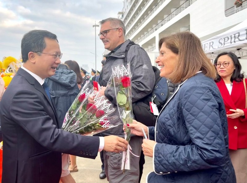 | Lãnh đạo tỉnh Quảng Ninh tặng hoa khách du lịch khi đến với Quảng Ninh - Ảnh: ĐĐK |