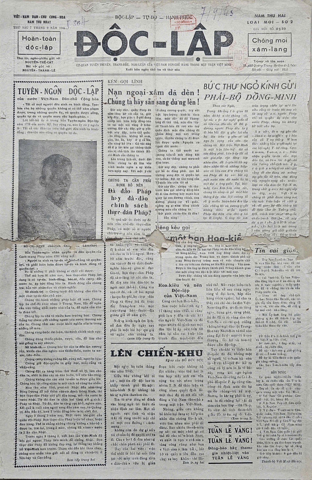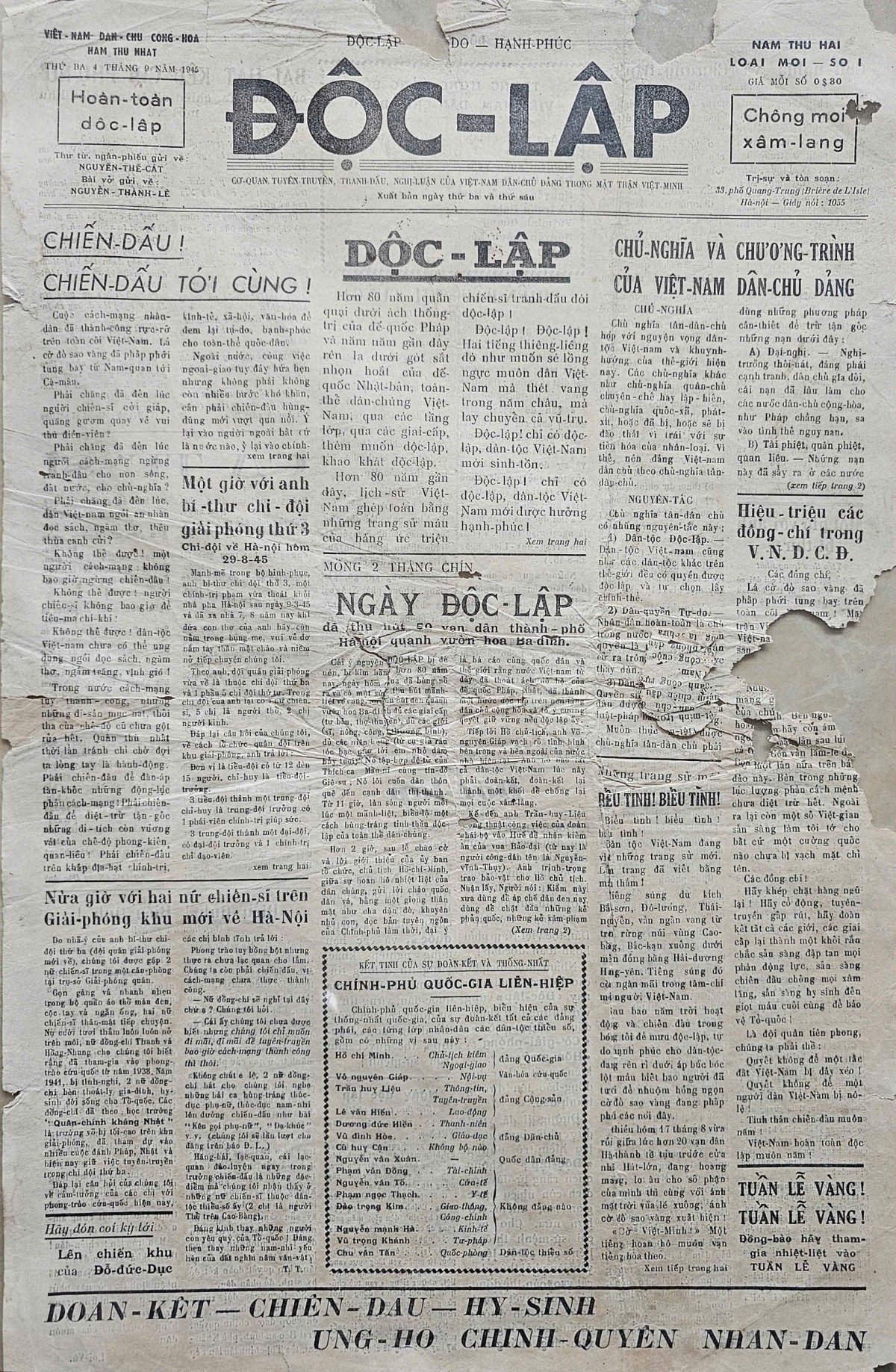 Một tư liệu rất quý liên quan đến ngày Quốc khánh 2/9 còn giữ lại được là các số báo Độc Lập- cơ quan tuyên truyền, tranh đấu và nghị luận của Việt Nam Dân chủ Đảng trong Mặt trận Việt Minh ra những ngày đầu tháng 9/1945.