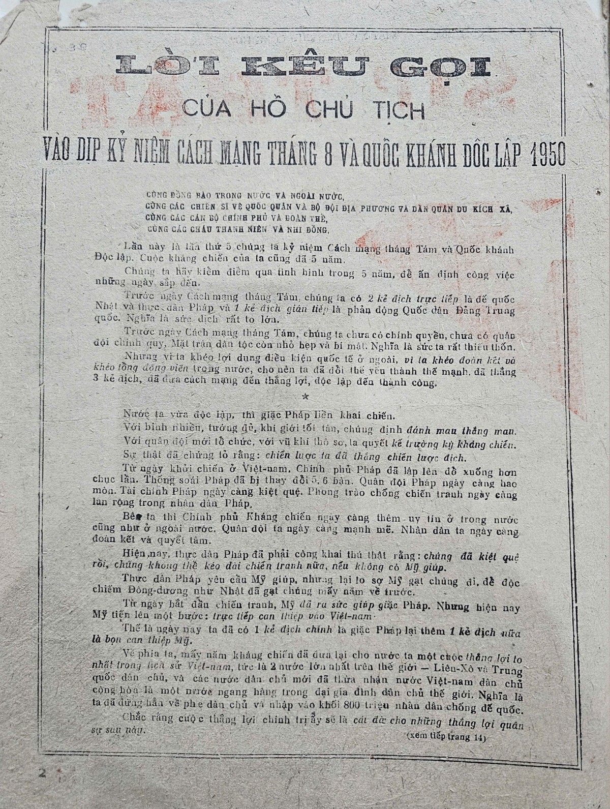 Trên báo Sự thật số ra ngày 19/8/1950 đã đăng Lời kêu gọi của Hồ Chủ tịch vào dịp kỷ niệm Cách mạng Tháng Tám và Quốc khánh độc lập 1950. Điểm đáng chú ý ở đây là lần đầu tiên, ngày Độc lập 2/9/1945 được Chủ tịch Hồ Chí Minh định danh là ngày Quốc khánh của nước Việt Nam Dân chủ Cộng hoà. Một nhận định quan trọng được nêu ra trong Lời kêu gọi này của Hồ Chủ tịch là thực dân Pháp đã kiệt quệ không thể kéo dài chiến tranh nữa, nếu không có Mỹ giúp. Đồng thời, Lời kêu gọi chỉ rõ một thế lực mới trực tiếp can thiệp vào Việt Nam là Mỹ.