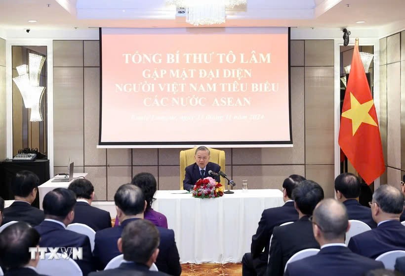 Theo đặc phái viên TTXVN, nhân chuyến thăm chính thức Malaysia, sáng 23/11, tại Kuala Lumpur, Tổng Bí thư Tô Lâm đã có cuộc gặp gỡ thân mật với đại diện kiều bào tiêu biểu, lãnh đạo hội đoàn, trí thức, doanh nhân người Việt tại các nước thành viên Hiệp hội các quốc gia Đông Nam Á (ASEAN).