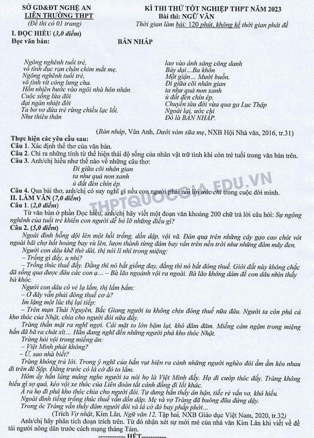 Theo phản ánh, phần làm văn của đề thi tốt nghiệp Trung học phổ thông 2023 môn ngữ văn trùng với đề thi thử của liên trường Trung học phổ thông tỉnh Nghệ An với cùng đoạn trích từ truyện ngắn 'Vợ nhặt' và nội dung câu hỏi có phần tương đồng.