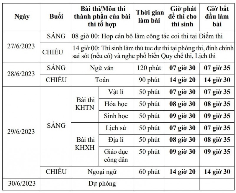 Các Hội đồng thi tổ chức coi thi trong các ngày 27,28,29,30/6; chấm thi từ ngày 1/7; công bố kết quả thi vào ngày 18/7; hoàn thành xét công nhận tốt nghiệp THPT chậm nhất ngày 20/7/2023.
