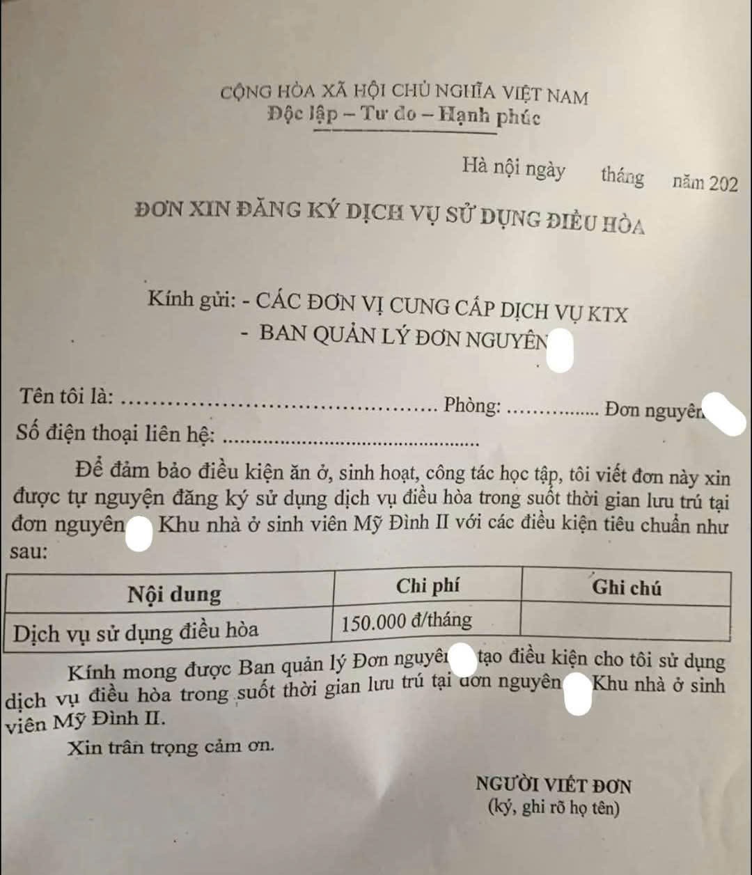 Theo sinh viên M.H.T, cả phòng nhận được thông báo của Ban quản lý lắp điều hòa từ cách đây vài tuần kèm theo là một mẫu lá đơn “tự nguyện” sử dụng điều hòa với số tiền 150 nghìn đồng/tháng/người. Dù không có nhu cầu sử dụng, nhưng dưới danh nghĩa “tự nguyện” kèm điều kiện “mềm” – “không đóng tiền sẽ cắt điện, cắt nước” nên cả phòng dù rất ấm ức vẫn phải ngậm ngùi hoàn thành việc đóng tiền trong 6 tháng liền.