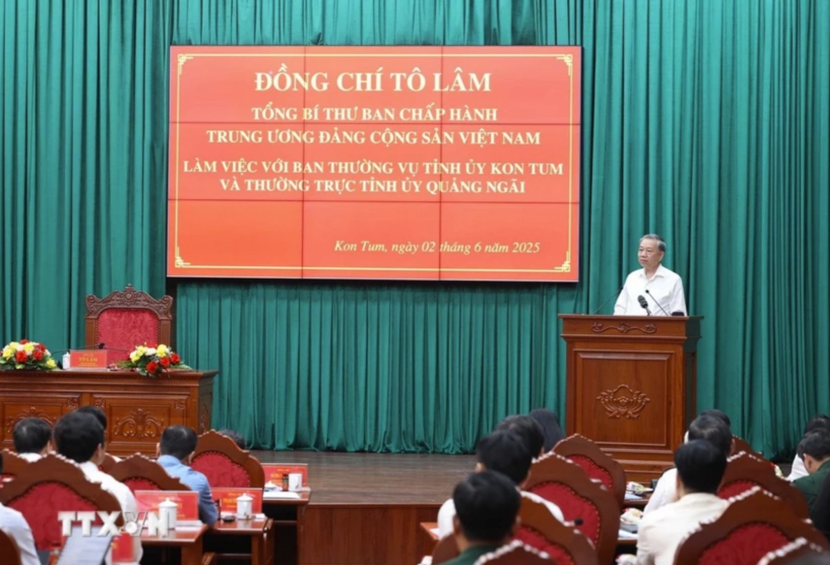 Chiều 2/6, tại tỉnh Kon Tum, Tổng Bí thư Tô Lâm và Đoàn công tác Trung ương đã làm việc với Ban Thường vụ Tỉnh ủy Kon Tum và Thường trực Tỉnh ủy Quảng Ngãi về triển khai thực hiện các nghị quyết, kết luận của Trung ương; việc sắp xếp, tinh gọn bộ máy, đơn vị hành chính và phát triển kinh tế - xã hội, đảm bảo quốc phòng, an ninh, xây dựng Đảng, công tác an sinh xã hội trên địa bàn hai tỉnh.