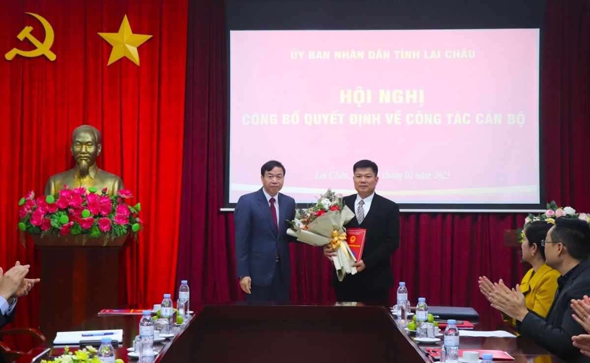 | Chủ tịch UBND tỉnh Lai Châu trao quyết định và chúc mừng ông Trần Văn Dũng. Ảnh: CTTĐTLC |
