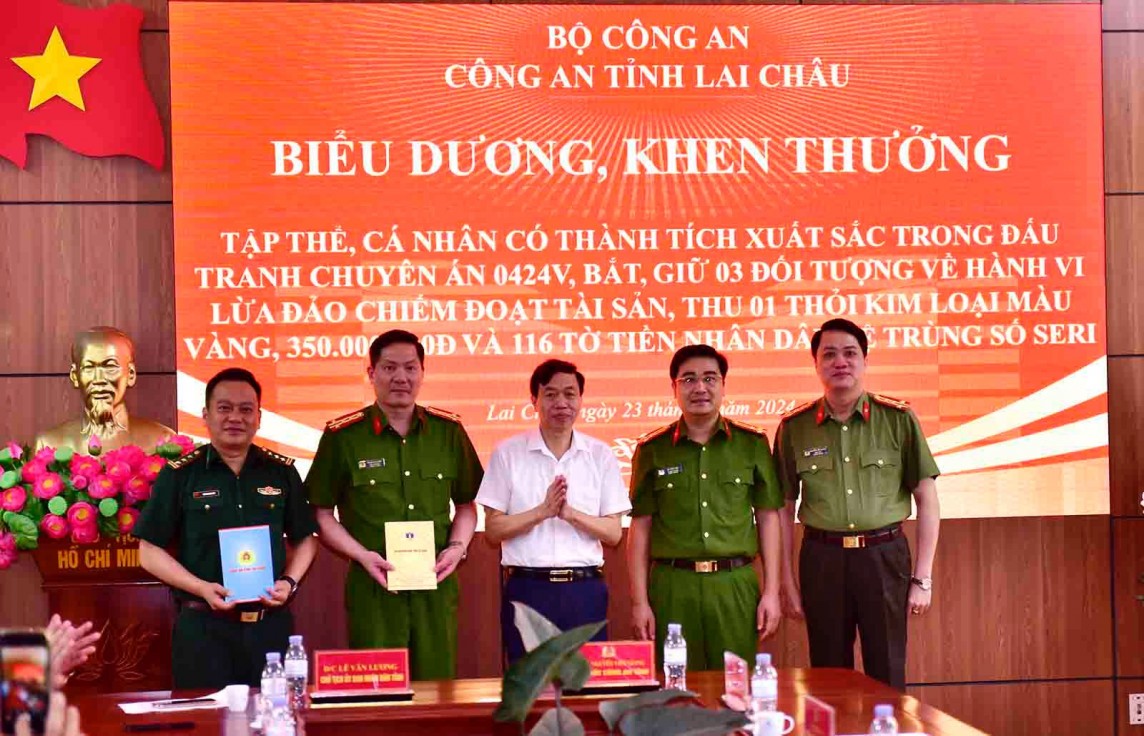| Phó Bí thư Tỉnh ủy, Chủ tịch UBND tỉnh Lai Châu Lê Văn Lương và Giám đốc Công an tỉnh Lai Châu Nguyễn Viết Giang khen thưởng lãnh đạo Ban Chuyên án 0424V. (Ảnh: CALCCC) |