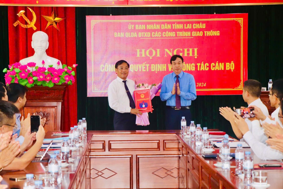 | Chủ tịch UBND tỉnh Lai Châu trao quyết định bổ nhiệm ông Mai Khắc Phượng giữ chức Giám đốc Ban Quản lý Dự án Đầu tư xây dựng các công trình Giao thông. Ảnh: CTTĐTLC |