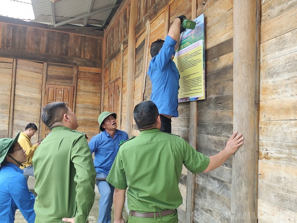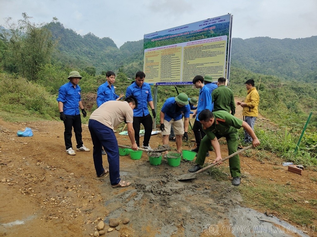 | Công an huyện Tam Đường phối hợp cùng Chi đoàn thanh niên Công ty Cổ phần đất hiếm Lai Châu - Vimico và Đoàn Thanh niên 2 xã Bản Hon, Bản Giang tổ chức cắm pano. (Ảnh: CALC) |