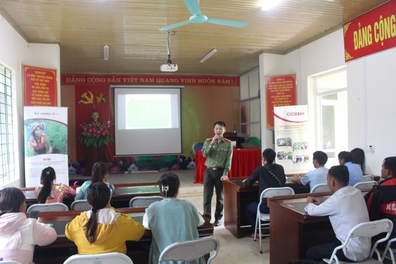| Cán bộ phòng An ninh đối ngoại Công an tỉnh Lai Châu tham gia tuyên truyền các quy định của pháp luật về bảo đảm an ninh, an toàn trong lĩnh vực du lịch (Ảnh: CALC) |