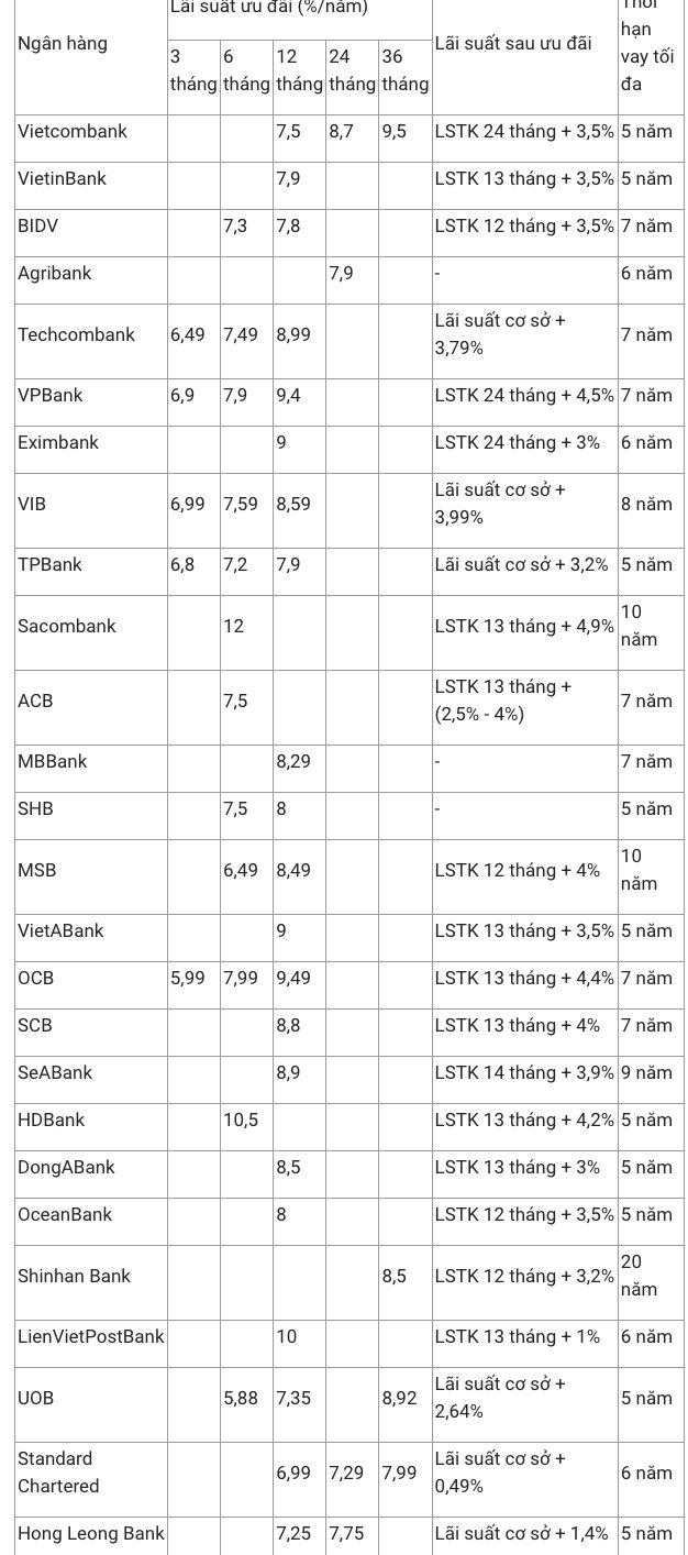 Hiện nay, hầu hết các ngân hàng tiếp tục tung ra các gói vay dựa trên các kỳ hạn vay cố định ban đầu khác nhau như: 3 tháng đầu, 6 tháng đầu, 12 tháng đầu,... và nhiều nhất lên tới 36 tháng đầu tiên của khoản vay.