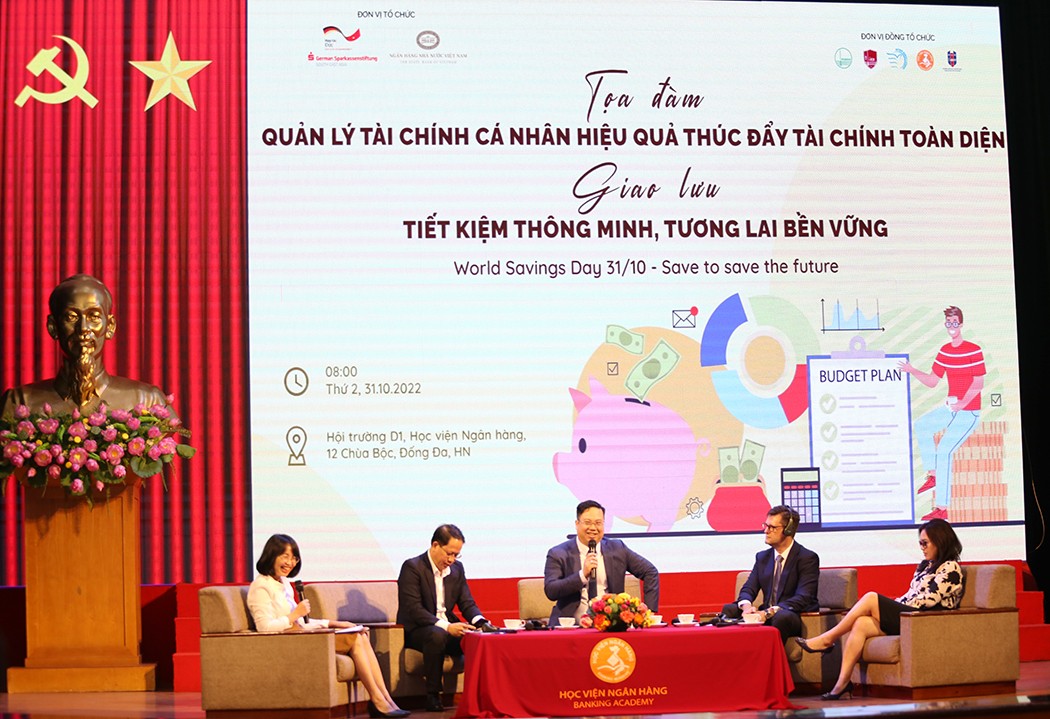 Chia sẻ tại tọa đàm “Quản lý tài chính cá nhân hiệu quả thúc đẩy tài chính toàn diện” và Giao lưu “Tiết kiệm thông minh, Tương lai bền vững” do Ngân hàng Nhà nước Việt Nam phối hợp với Tổ chức hợp tác quốc tế Sparkassenstiftung Đức (DSIK) tổ chức TS. Bùi Hữu Toàn, Chủ tịch Hội đồng Học viện Ngân Hàng cho biết, hưởng ứng kỷ niệm Ngày Tiết kiệm thế giới (31/10) Ngân hàng Nhà nước, Tổ chức DSIK và 4 trường Đại học, Học viện gồm Học viện Ngân hàng, Đại học Ngân hàng TP. Hồ Chí Minh, Đại học Kinh tế - Đại học Quốc gia Hà Nội và Học viện Phụ nữ Việt Nam đồng tổ chức toạ đàm nhằm tạo thói quen tiết kiệm từ sớm cho thế hệ trẻ. Từ đó, tạo phong trào tiết kiệm trong xã hội, hướng tới đối tượng của tài chính toàn diện.