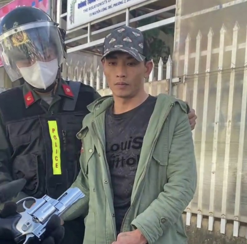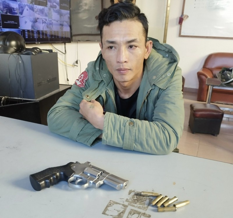 | Đối tượng Trần Nguyễn Ngọc Hân cùng với tang vật là khẩu súng và 6 viên đạn tại trụ sở Công an phường 2, Công an TP. Đà Lạt |