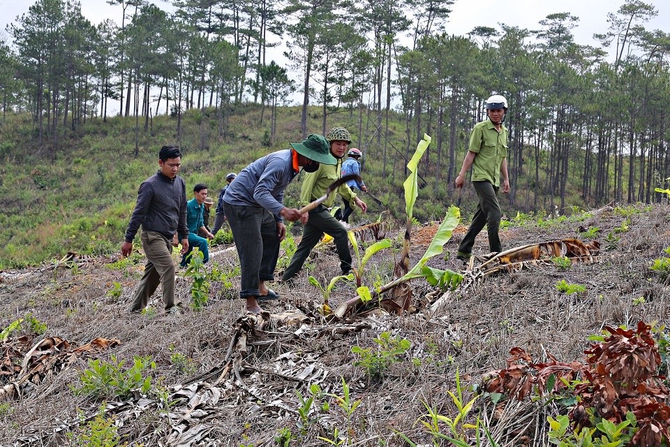 | Lực lượng chức năng huyện Đam Rông tiến hành giải toải cây trồng lấn chiếm đất lâm nghiệp (Ảnh: CTV). |