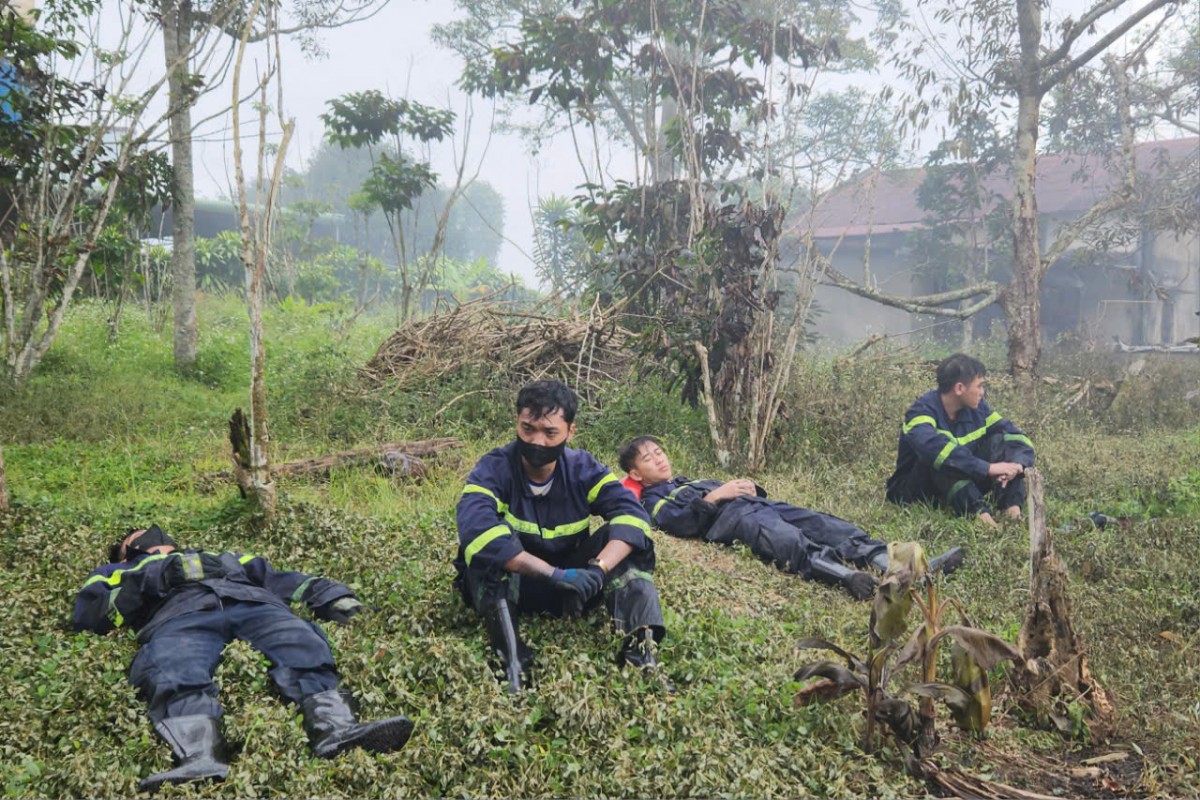 | Sau nhiều giờ chữa cháy đã vắt kiện sức của cán bộ, chiến sĩ Công an. (Ảnh: CTV) |