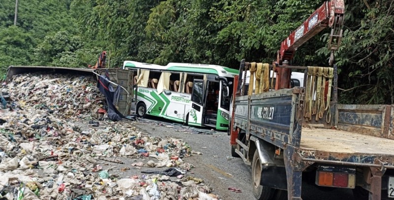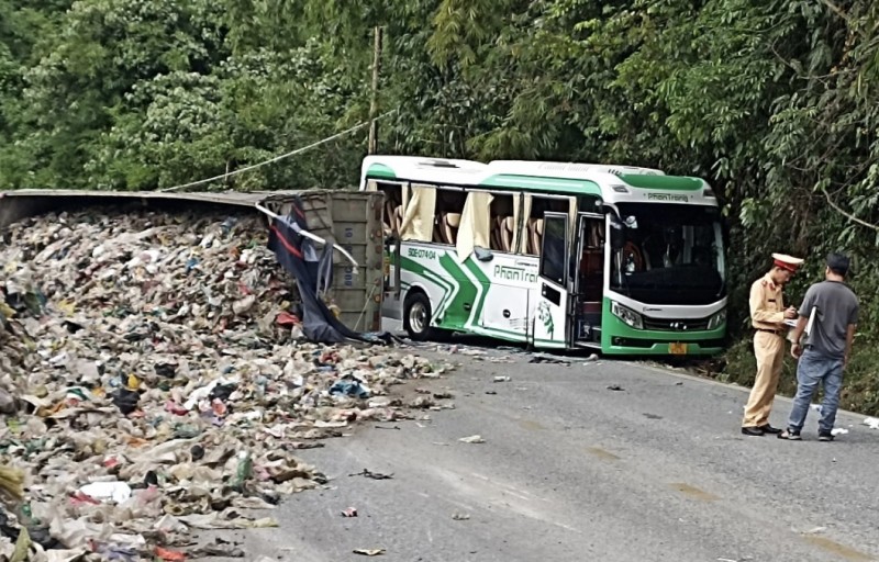 Khi xảy ra tai nạn, xe tải biển kiểm soát 60C-408.xx được xác định đang chở phế liệu (rác), còn xe khách đang chở khoảng 19 người. Ghi nhận tại hiện trường, xe tải bị lật nghiêng nằm chắn ngang gần như hết phần đường đối diện, khiến phế liệu (rác) bên trong thùng xe đổ tràn xuống đường, còn xe khách bị ép dựa vào vách núi khiến toàn bộ kính xe bên phụ vỡ nát.