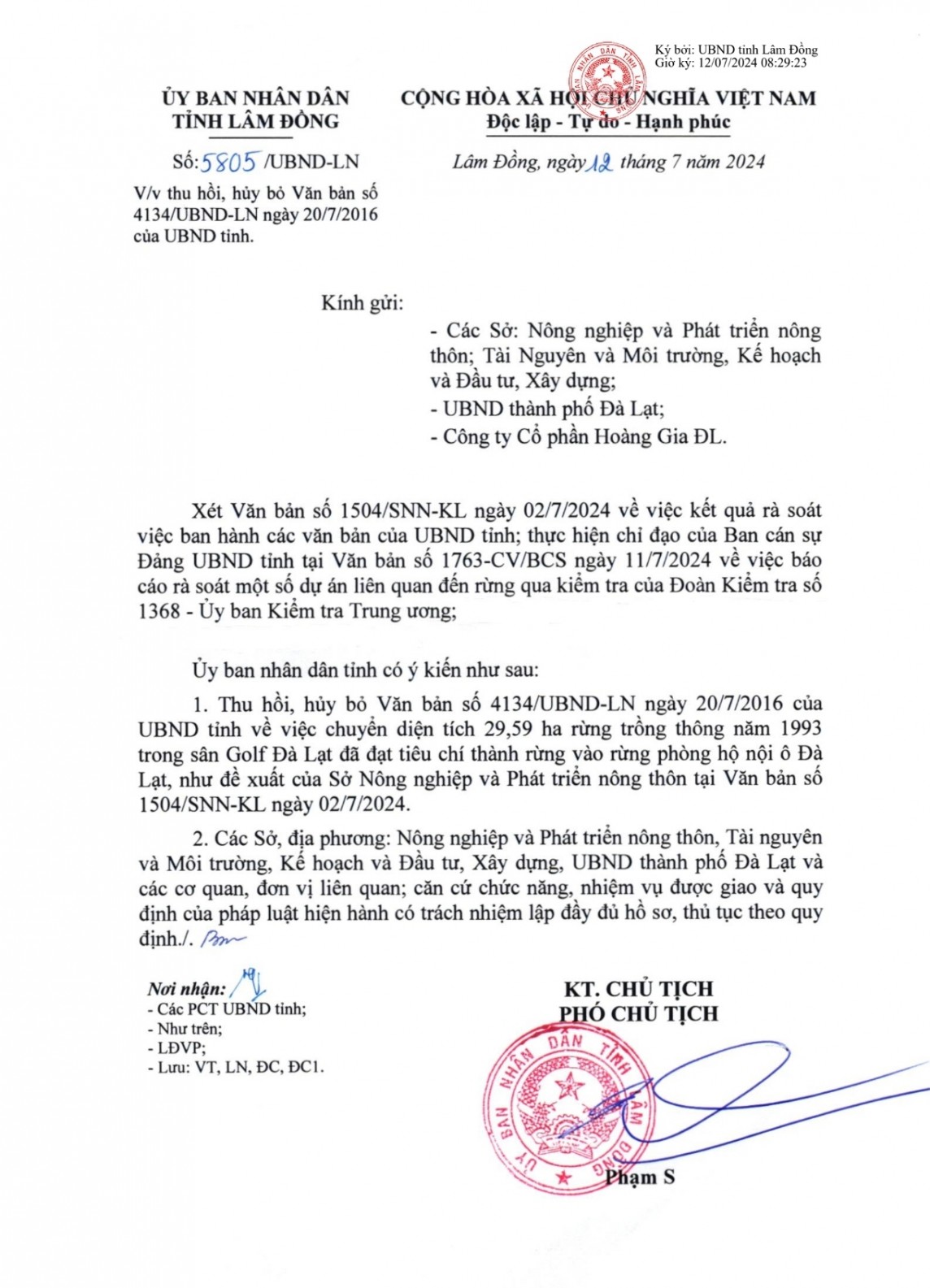 Ngày 12/7/2024, UBND tỉnh Lâm Đồng vừa ban hành văn bản 5805/UBND-LN về việc thu hồi, hủy bỏ văn bản số 4134/UBND-LN ngày 20/7/2016 về việc đưa 29,59 ha đất trồng cây thông trên Đồi Cù Đà Lạt trở thành diện tích rừng phòng hộ nội đô. Như vậy, toàn bộ Dự án sân golf Đồi Cù không có diện tích đất rừng phòng hộ.