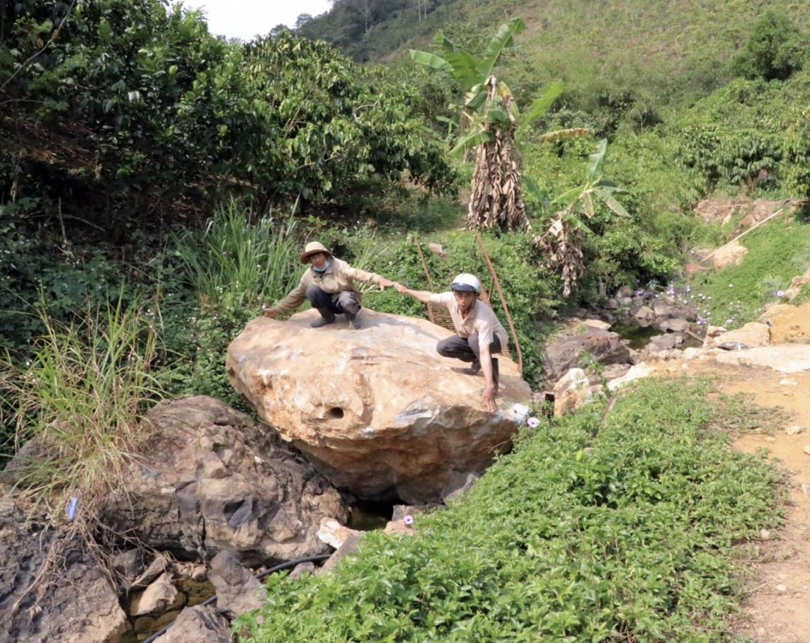 | Một tảng đá nặng hàng tấn lăn từ mỏ đá thuộc Công ty TNHH khai thác đá Thái Sơn xuống vườn cà phê của người dân. Ảnh: CTV |