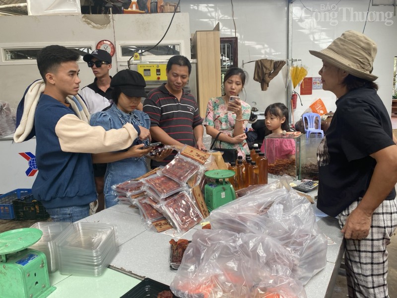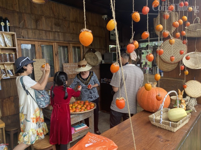 | Bà Đặng Thị Thu Vân (áo đen), chủ vườn hồng Lễ Vân đang tiếp thị, bán các sản phẩm được chế biến từ hồng cho khách du lịch |