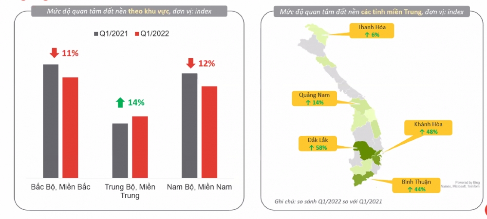 Cũng theo thông tin từ Batdongsan.com.vn, dòng tiền đang có sự chuyển hướng từ miền Bắc vào miền Trung. Tại miền Trung, mức độ quan tâm tăng 14%, với những địa bàn "nóng" là Đắk Lắk, Khánh Hòa, Bình Thuận....