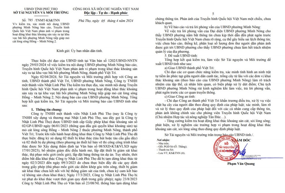 Kết quả kiểm tra của liên ngành xác định: Công ty Nhật Linh Phú Thọ được UBND tỉnh Phú Thọ cấp Giấy phép khai thác khoáng sản số 02/GP-UBND ngày 6/1/2023 tại mỏ cát lòng sông Hồng – Minh Nông 2 thuộc phường Minh Nông, TP. Viêt Trì.