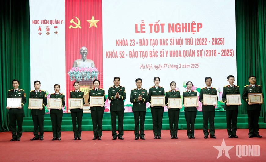 Sáng ngày 27/3, tại Hà Nội, Học viện Quân y đã tổ chức Lễ tốt nghiệp cho 21 học viên Khóa 23 (đào tạo bác sĩ nội trú) và 276 học viên Khóa 52 (đào tạo bác sĩ y khoa quân sự). Đặc biệt, trong dịp này, có 16 học viên đào tạo bác sĩ đa khoa quân y xuất sắc đã được phong quân hàm thượng úy.