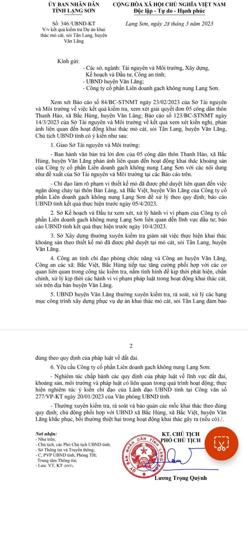 Sau khi báo chí đăng tải, ngày ngày 28/3, UBND tỉnh Lạng Sơn đã có công văn số 346/UBND-KT (Văn bản số 346) chỉ đạo các Sở, ngành và đơn vị liên quan xem xét, xử lý hành vi vi phạm của Công ty Gạch không nung Lạng Sơn.