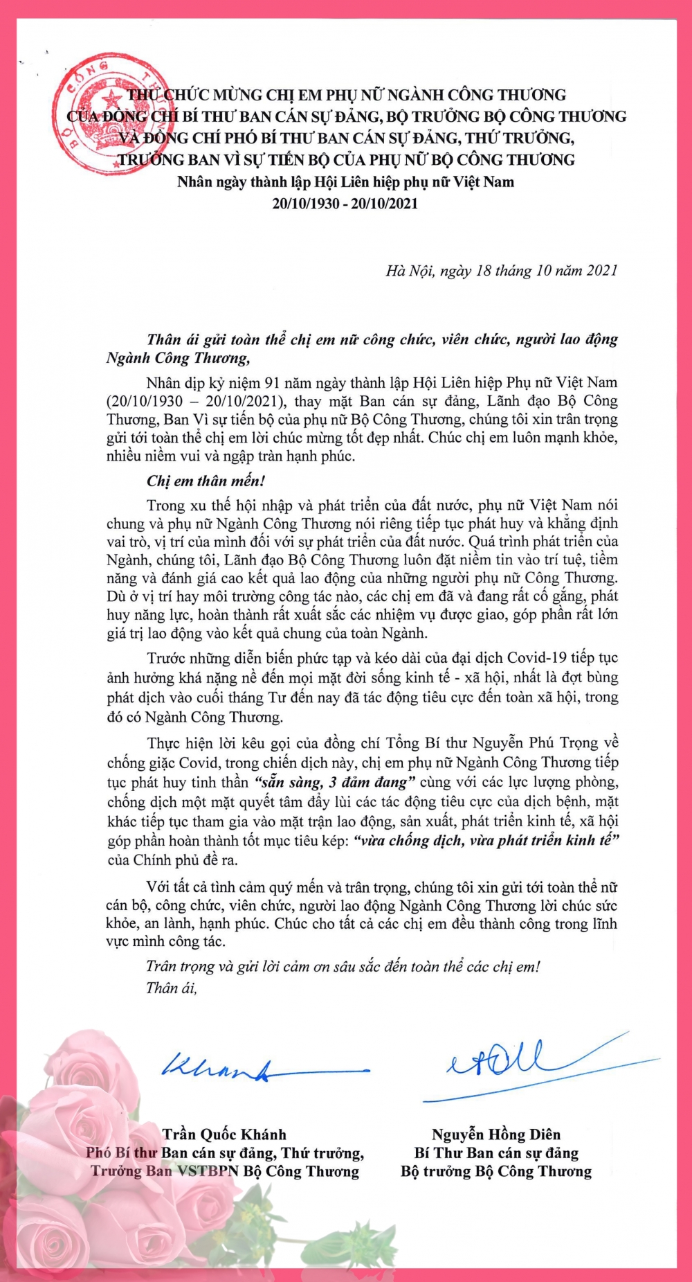 Nhân dịp kỷ niệm 91 năm ngày thành lập Hội Liên hiệp Phụ nữ Việt Nam (20/10/1930 - 20/10/2021), Bí thư Ban cán sự Đảng, Bộ trưởng Bộ Công Thương - Nguyễn Hồng Diên và Lãnh đạo Bộ Công Thương đã gửi thư chúc mừng chị em phụ nữ ngành Công Thương. Dưới đây là toàn văn bức thư.